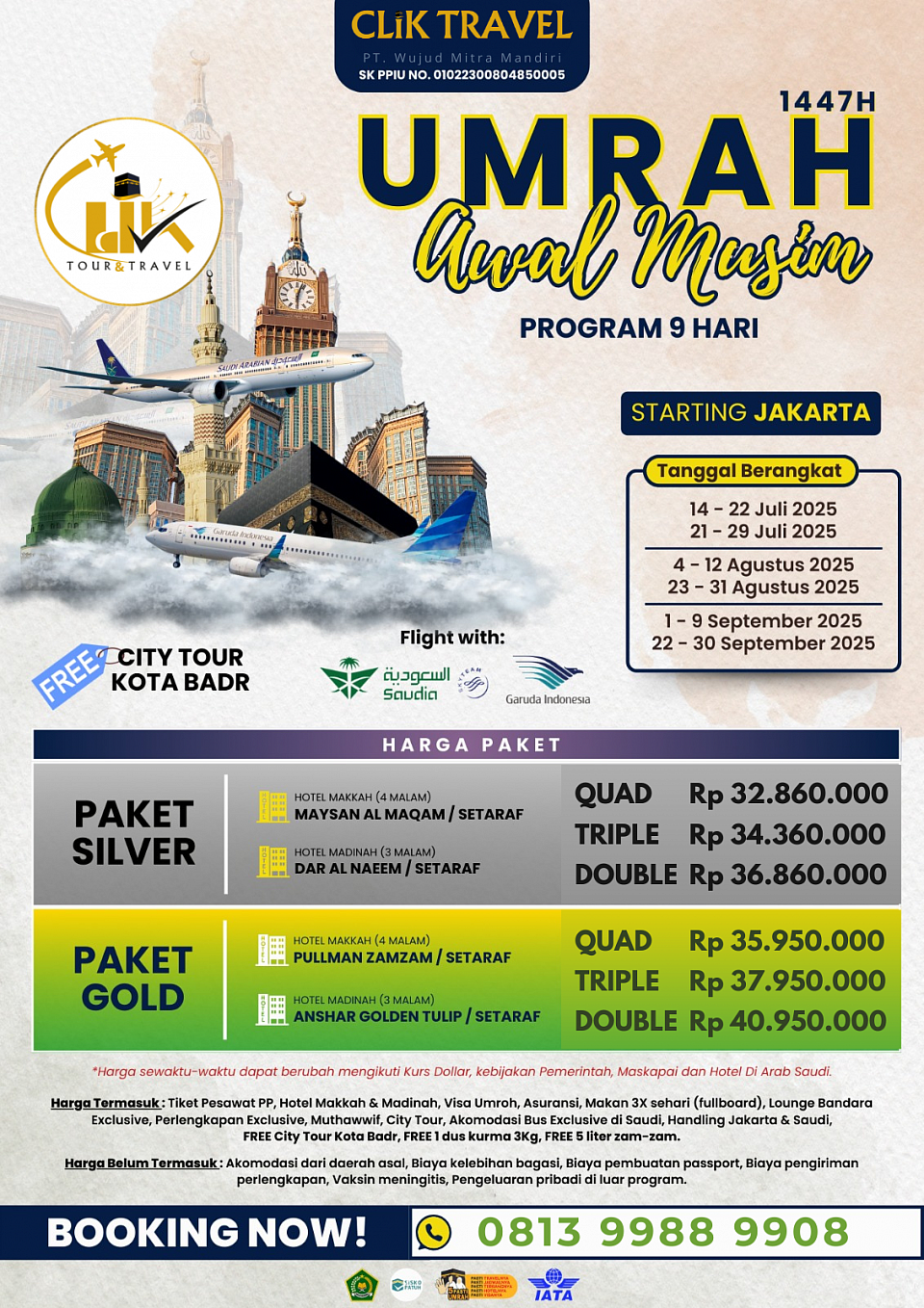 Paket Umroh Murah dari Clik Travel - PT. Cahaya Lima Kencana menawarkan pengalaman Paket ibadah Umroh yang lengkap dan terjangkau. Paket ini biasanya mencakup: